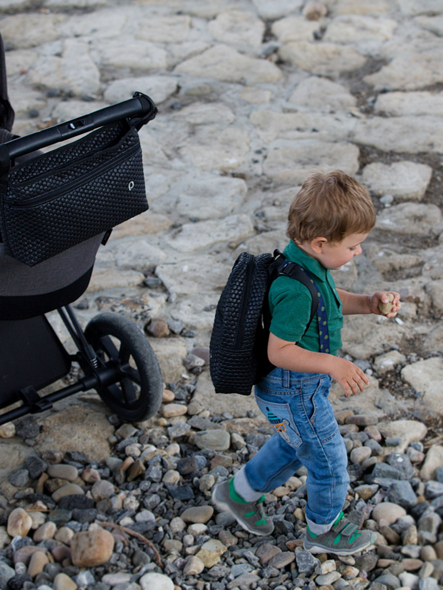 Die Kinderwagentasche um Getränke und Kleinigkeiten verstauen zu können.