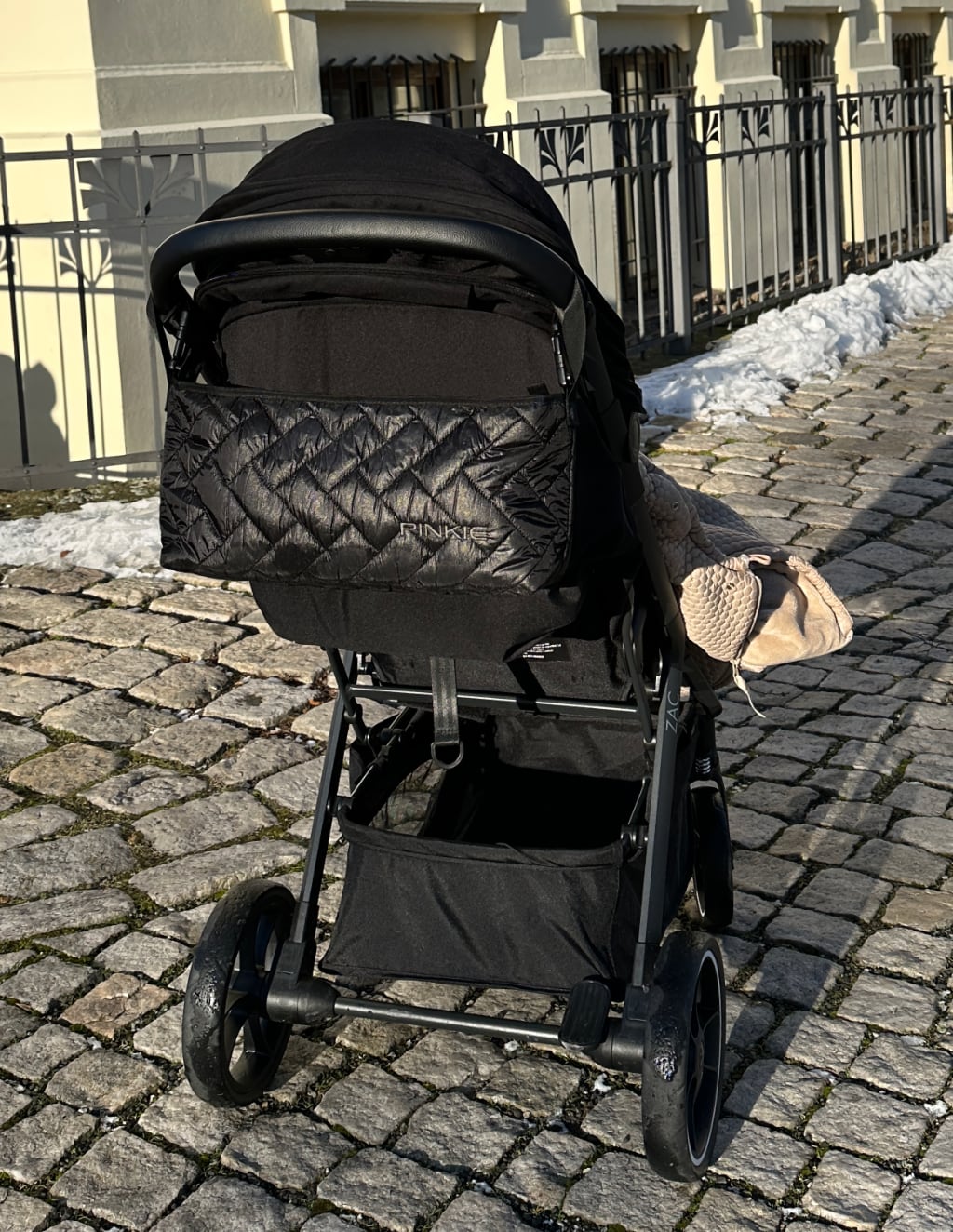 Die Kinderwagentasche um Getränke und Kleinigkeiten verstauen zu können.
