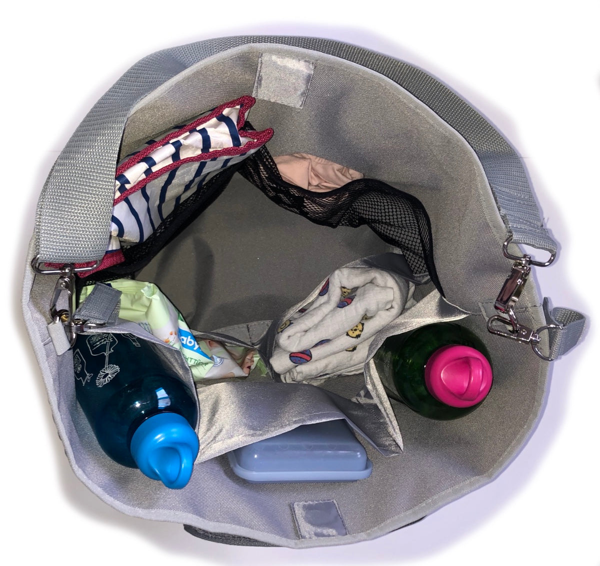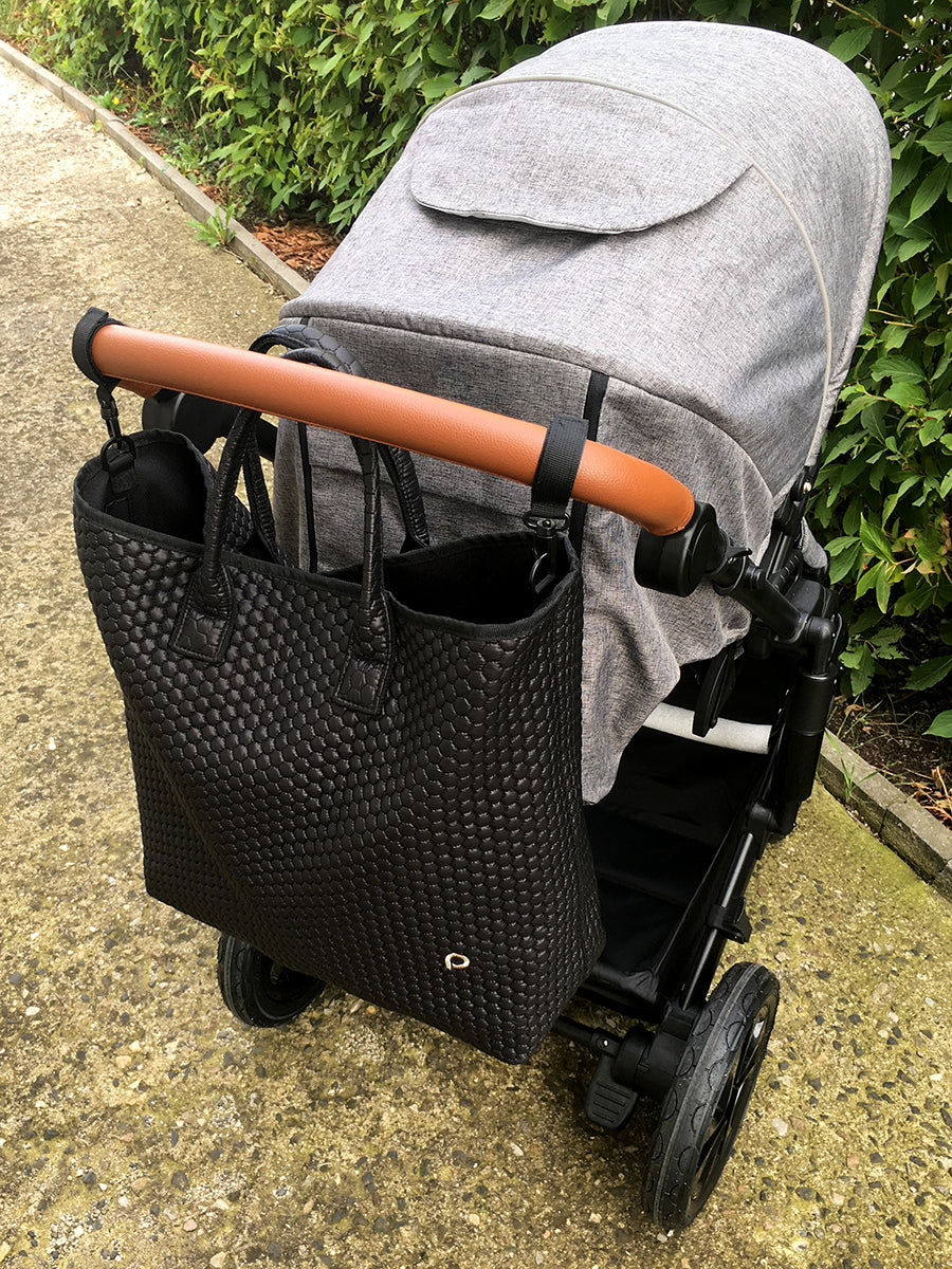 - Es ist möglich die Tasche an den Kinderwagen zu hängen, es gibt eingenähte Schlaufen an der Tasche- durch diese lässt sich ganz einfach Karabiner stecken und dann an den Kinderwagen aufhängen (die Karabiner sind nicht inkludiert)