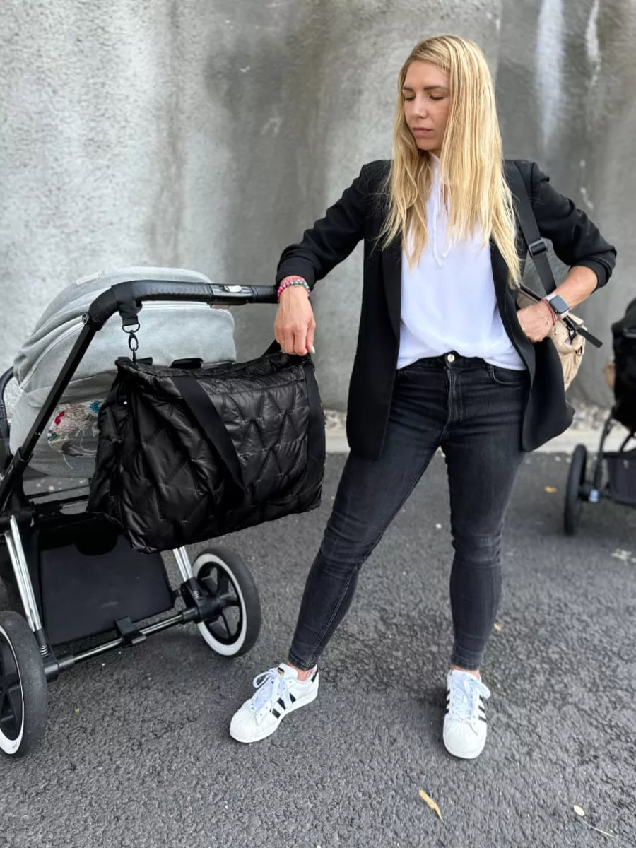 Praktische, leichte und voluminöse Handtasche, nutzbar auf verschiedene Wege, unter anderem auch als Wickeltasche.