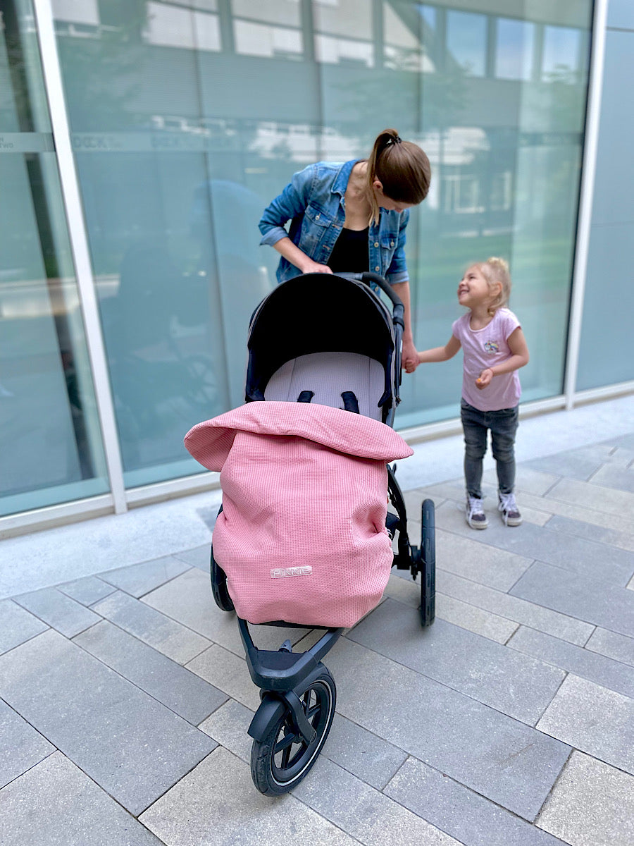 Decke für Kinderwagen, die ganz einfach durch zusammenziehen der eingenähten Schnurr unten, zu einer Beindecke umgewandelt werden kann. Die Decke hält dann schön um die Füße.